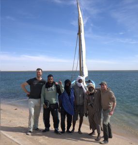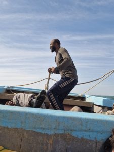 Na een paar dagen aan boord te zijn (deze is nieuw voor mij. vertrouw ik erop dat Yhfdou ons op tijd naar het eiland brengt. Alleen de Imragen, het volk waartoe hij behoort mag hier met zeilbootjes zonder motoren vissen. Hij vaart al jaren op dit vissersschip en kent het gebied op zijn duim. Ik zou verdwalen in dit platte doolhof. Druk maken over tijd of de wind doet hij niet. Schelle klanken van drums, de Tidrit een luid-achtig snaarinstrument, en de Ardin een harpachtig-instrument galmen uit zijn telefoon. Terwijl hij aan het roer staat danst en zingt hij over het dek.